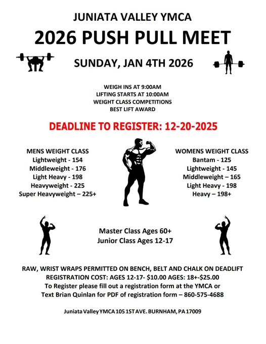 The Juniata Valley YMCA will be having their 2026 Push Pull Meet Sunday, January 4th. Weigh ins start at 9am and lifting will start at 10am. The cost is $10 for ages 12 to 17 and $25 for anyone 18 and older.